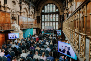 [15:07] Dawn Dunn, Senior Inward Investment Manager of event sponsors, Invest Newcastle, took to the stage to welcome attendees to the Common Room; a truly beautiful setting. Joe Roche then introduced [27:40] Christopher Sier, Chairman of FinTech North, who joined us virtually to share his thoughts on the North East’s FinTech ecosystem, before wishing attendees well for the rest of the day.